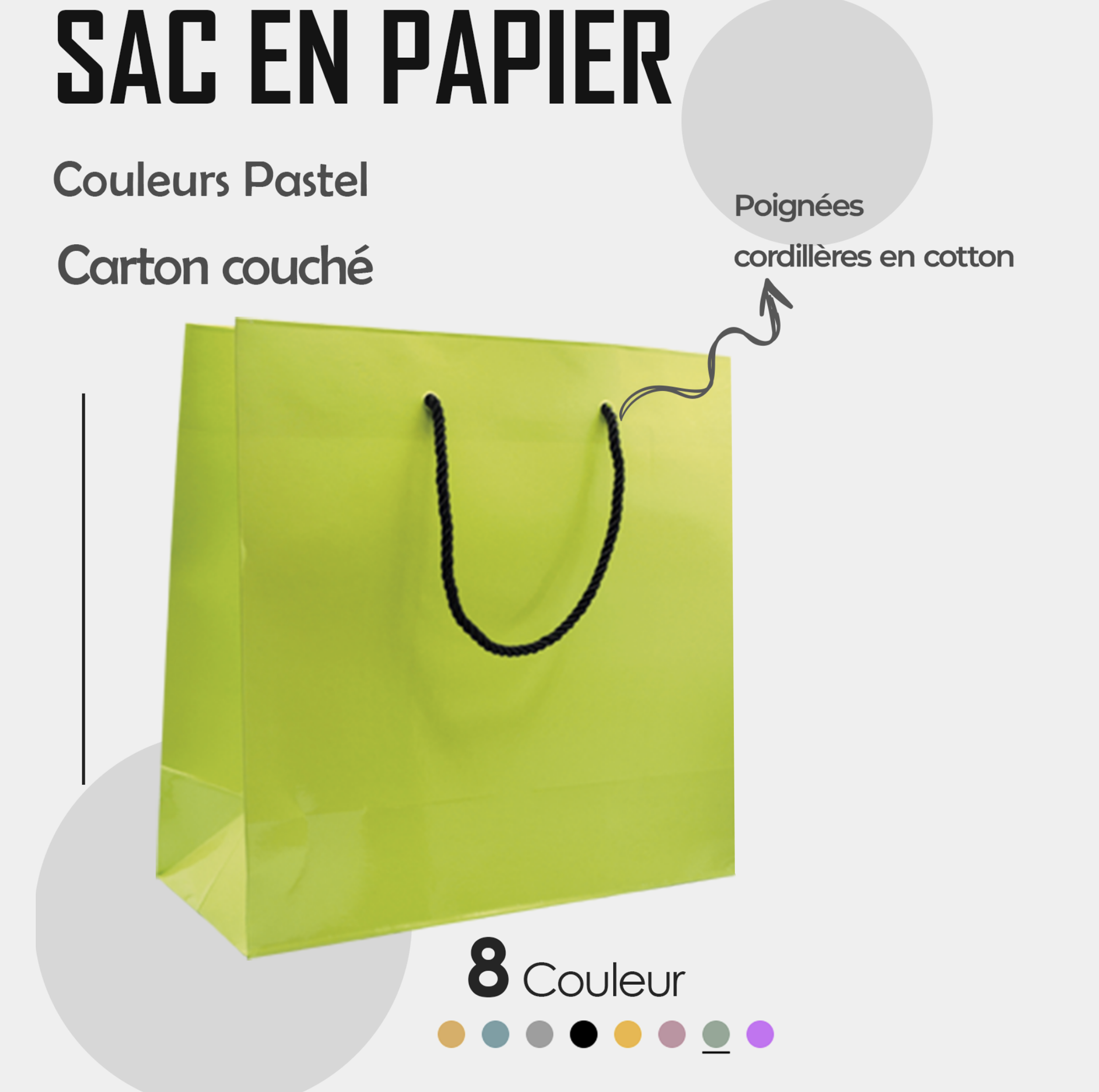 Sac en carton couché et des poignées cordillères et doublement renforcées pour plus de confort et de solidité. Unique sur le marché, ce sac peut contenir jusqu’à 5 kg de contenu. Il est fabriqué avec du carton couché blanc imprimé, avec une largeur de 24 cm avec soufflet latéral de 13cm et une hauteur de 25cm. Vendue à un excellent prix en Tunisie, ce sac est disponible sur printing.sitpec.com